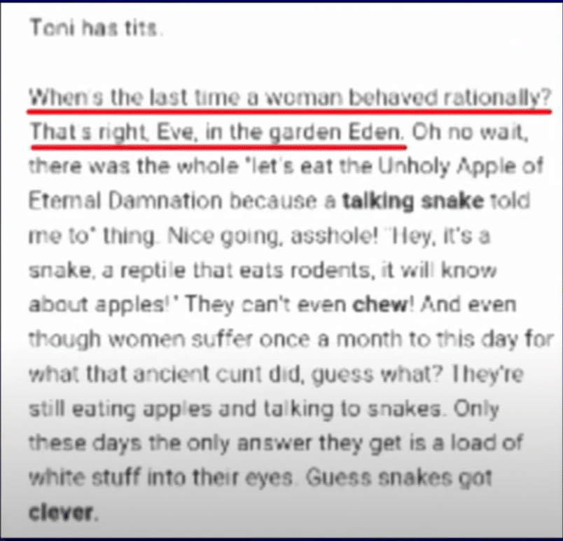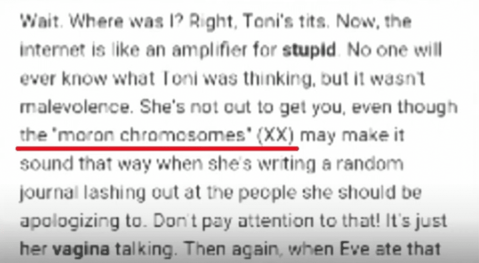 It wasn’t private. A lot of it was on a blog. He publicly posted a bunch of this garbage and he deserves the backlash he gets for it. He often talked about women being inferior, dumb, and not fit for existence in general without the help of a “man”. He believed all of that to be humor.