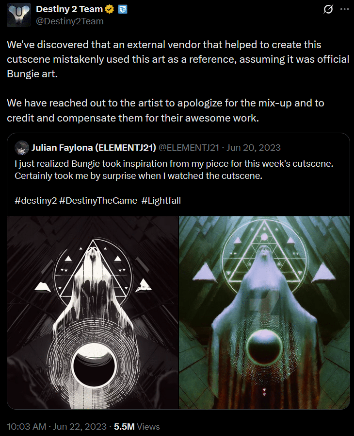 To prevent similar issues in the future, we are conducting a thorough review of our in-game assets, specifically those done by the former Bungie artist, and implementing stricter checks to document all artist contributions.”