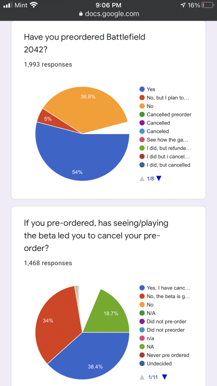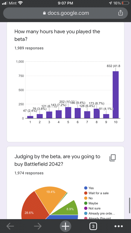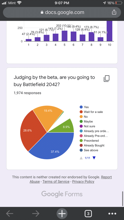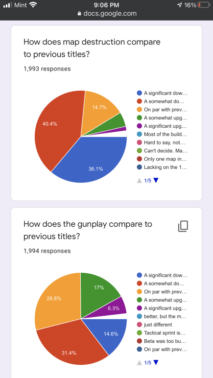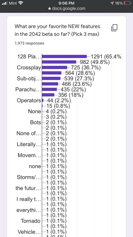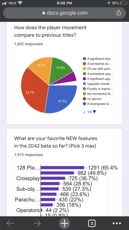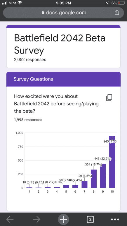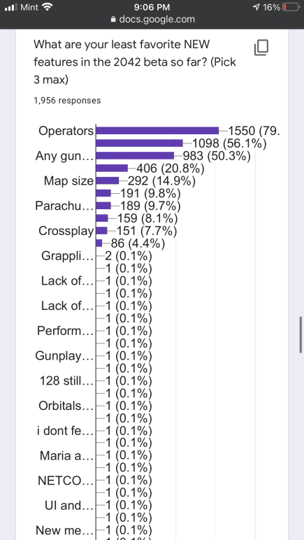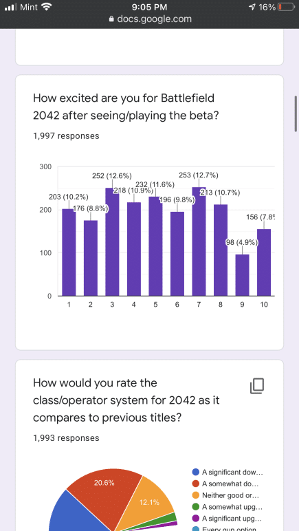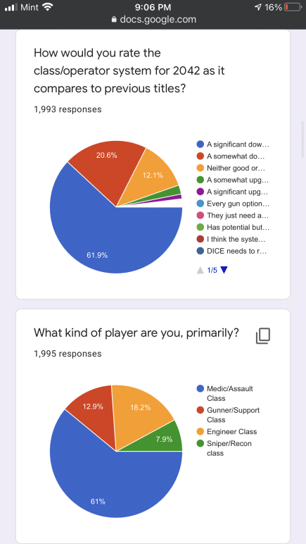 Some of the questions in the Battlefield 2042 communtiy survey are similar to the ones EA sent out to players. That said, the results here are not indicative of the entire Battlefield franchise, given there are less than 3,000 participants. Even so, it is still something to chew on for Battlefield fans. You can check it out in full right here via Google docs, or peruse the screenshots we’ve taken.