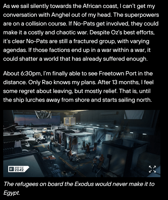 The culmination of all these Journey of the No-Pats entries will be revealed tomorrow, as that’s when the Battlefield 2042 standalone short film titled “Exodus” will air! Once it’s out, we’ll be sure to let our readers know.