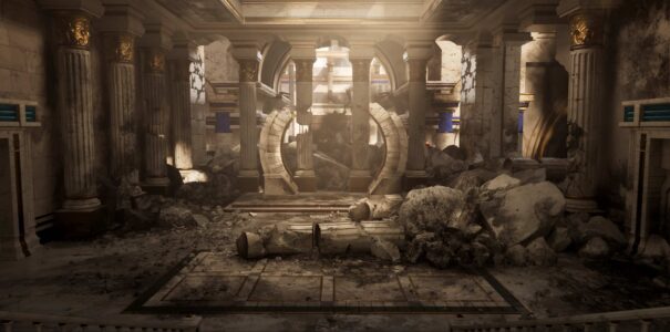 The setting shown most is the interior of a destroyed temple, but there’s also a peek at another zone with a more industrial look, described by the artist as a spaceport. It is also stated that the locations belong to two-story missions in the game.