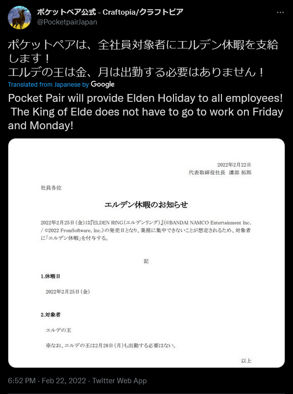 Given that Elden Ring is probably the most highly-anticipated release of 2022, it’s a blessing for some of these PocketPair developers to be able to play it without being stressed out over the weekend as Monday approaches. According to the tweets, employees won’t have to come into the office personally by Monday, which is today.