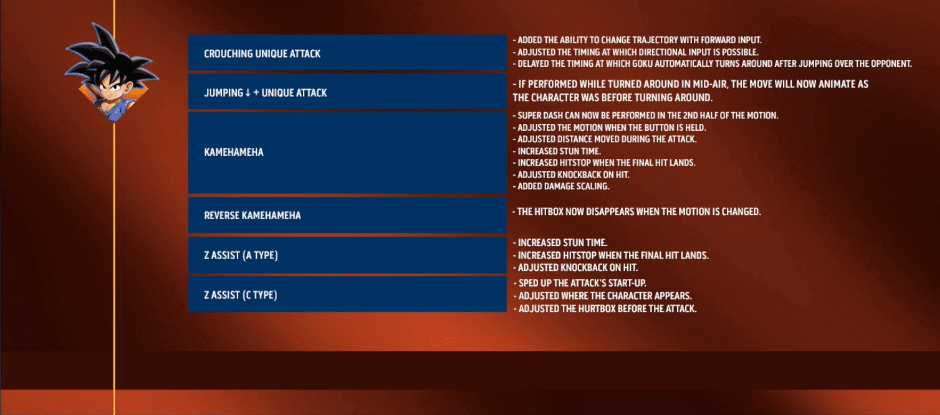 Jumping Heavy Attack – The opponent is now knocked forward when there is a camera motion. — Fixed an issue in which some characters could earn a Dragon Ball under certain conditions without performing a super combo.