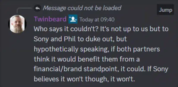Responding to that, Petersson states, “Who says it couldn’t? It’s not up to us but to Sony and Phil to duke out, but hypothetically speaking, if both partners think it would benefit them from a financial/brand standpoint, it could. If Sony believes it won’t though, it won’t.”