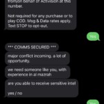 The number that flashes during the opening’s green hue is: +12029183022. Obviously, this is a US phone number, and if you’re going to message it, please check with your mobile service provider for charges and whatnot. If you don’t want to message the number, you can just see the text message screenshots below (via IPlayCOD) to see what happens.