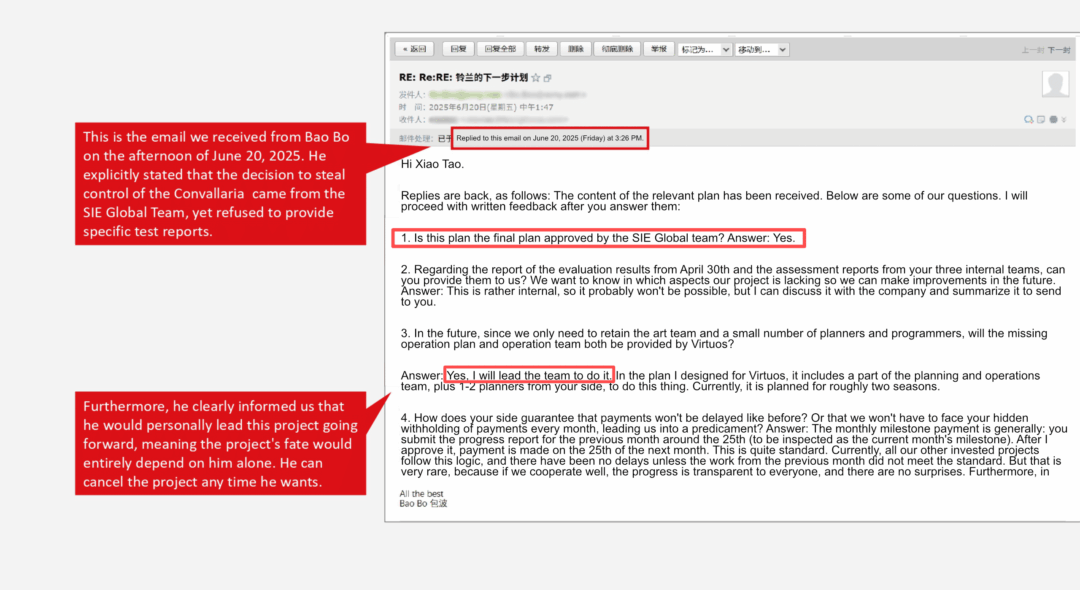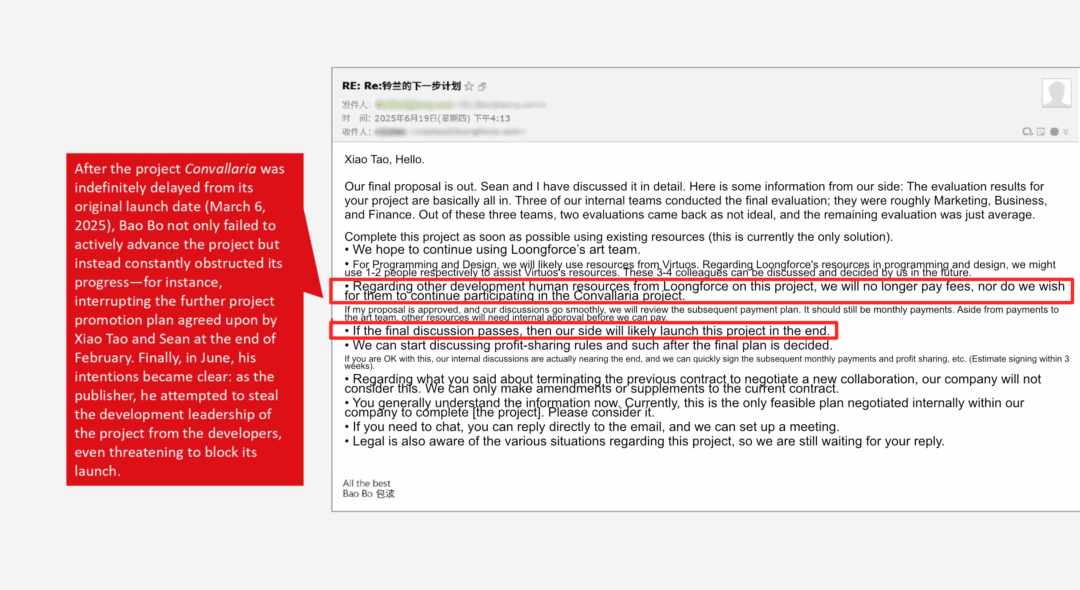 Included in the documentation provided to us are email exchanges between Loongforce and Bo Bao, Director of China Game Production at Sony Interactive Entertainment. These discussions, which we translated below for clarity, appear to corroborate Loongforce’s accusations regarding delayed payments and explicit threats to have the support studio Virtuos take over the project’s development completely.