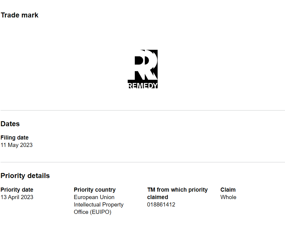 The trademarks for Remedy’s logo are visible online on the UK’s Intellectual Property Office website. We’ve included images of the trademarks for viewing below: