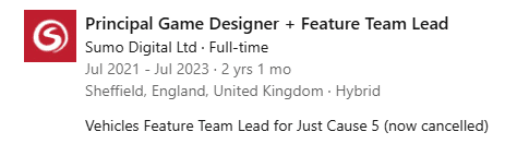 The information comes from the profile of a former Sumo Digital employee, who worked as the Vehicles Feature Team Lead on the project from 2021 to 2023, before it was ultimately canceled.