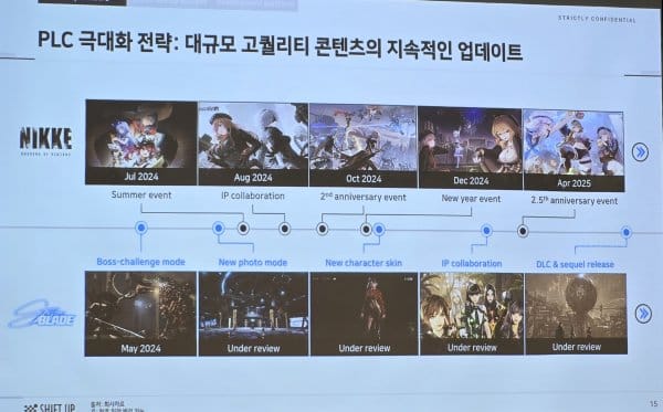 Aside from Photo Mode in August, Shift Up is also considering releasing a new skin in October, an IP collaboration in December, and even a DLC and sequel release sometime in 2025. Note that none of this has been confirmed, as it clearly states they are “under review” from what appears to be a slide intended for employees only given the “strictly confidential” marking in the upper right. This could also be the reason why nothing official hasn’t been announced yet, as Shift Up might be finalizing things before they tell the game’s fans what’s incoming for the game.