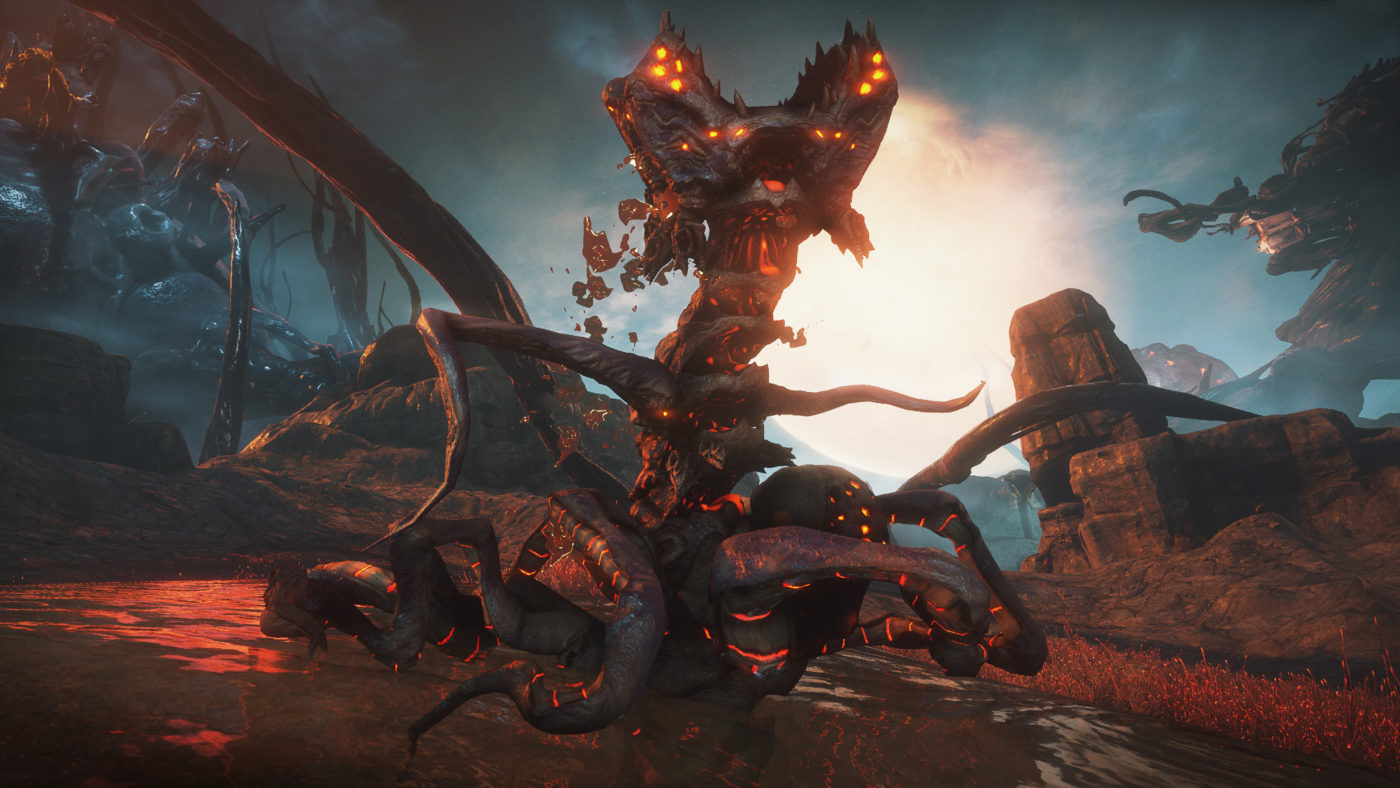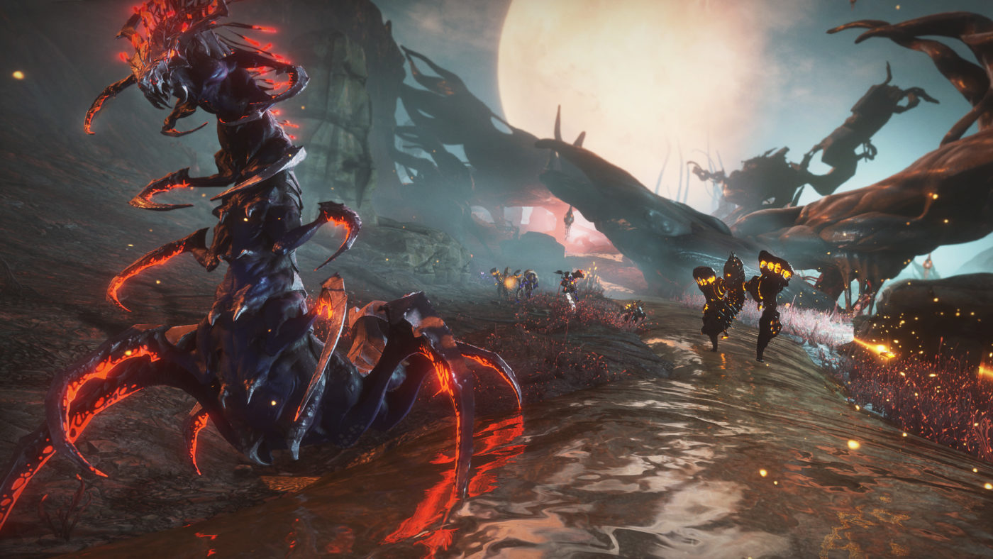 On the moon surface, players will find themselves thrust into the sticky, pulsing, and terrifying hivemind landscape of the Infested faction, where nearly everything feels alive and connected. Giant towering wyrms, silhouetted against the darkened red sky, battle for control overnight and day, while on the ground bulbous pods burst open with Entrati NPCs consumed and transformed by the Infested hive mind or a cadre of belligerent Infested creatures, ready to attack.