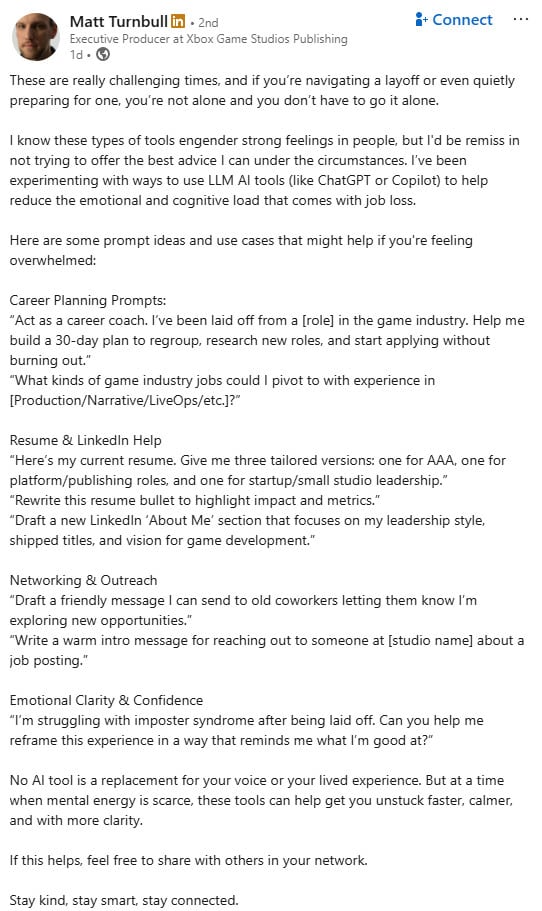 In a now-deleted post on LinkedIn (archived), Matt Turnbull, an Xbox Executive Producer, shared a lengthy post offering helpful tips to those affected by the layoffs. The issue is that the advice he gave wasn’t particularly sound, especially given the news that the layoffs were driven by increased AI investment. As a result, he suggested that those struggling to utilize AI to assist them during these challenging times.