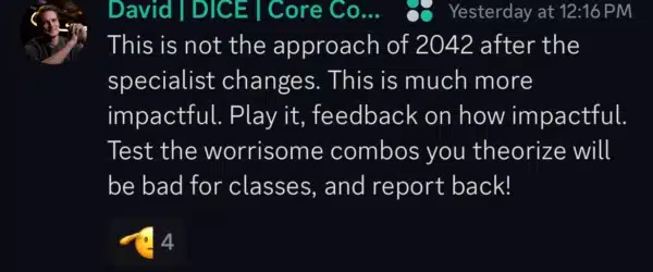 “This is not the approach of 2042 after the specialist changes. This is much more impactful. Play it, feedback on how impactful. Test the worrisome combos you theorize will be bad for classes, and report back!,” said Sirland.