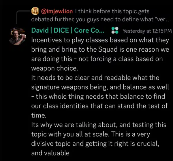 Perhaps the most important part, one community member shared that not locking weapons to specific classes “doesn’t seem like a huge deal.” They add, “it makes playing support roles a lot more fun imo. No more being locked into SMGs just because you want to repair vehicles.” This is very good news, and should quell some of the outrage from the community that a developer from DICE even had to make an announcement about it on the private Discord.