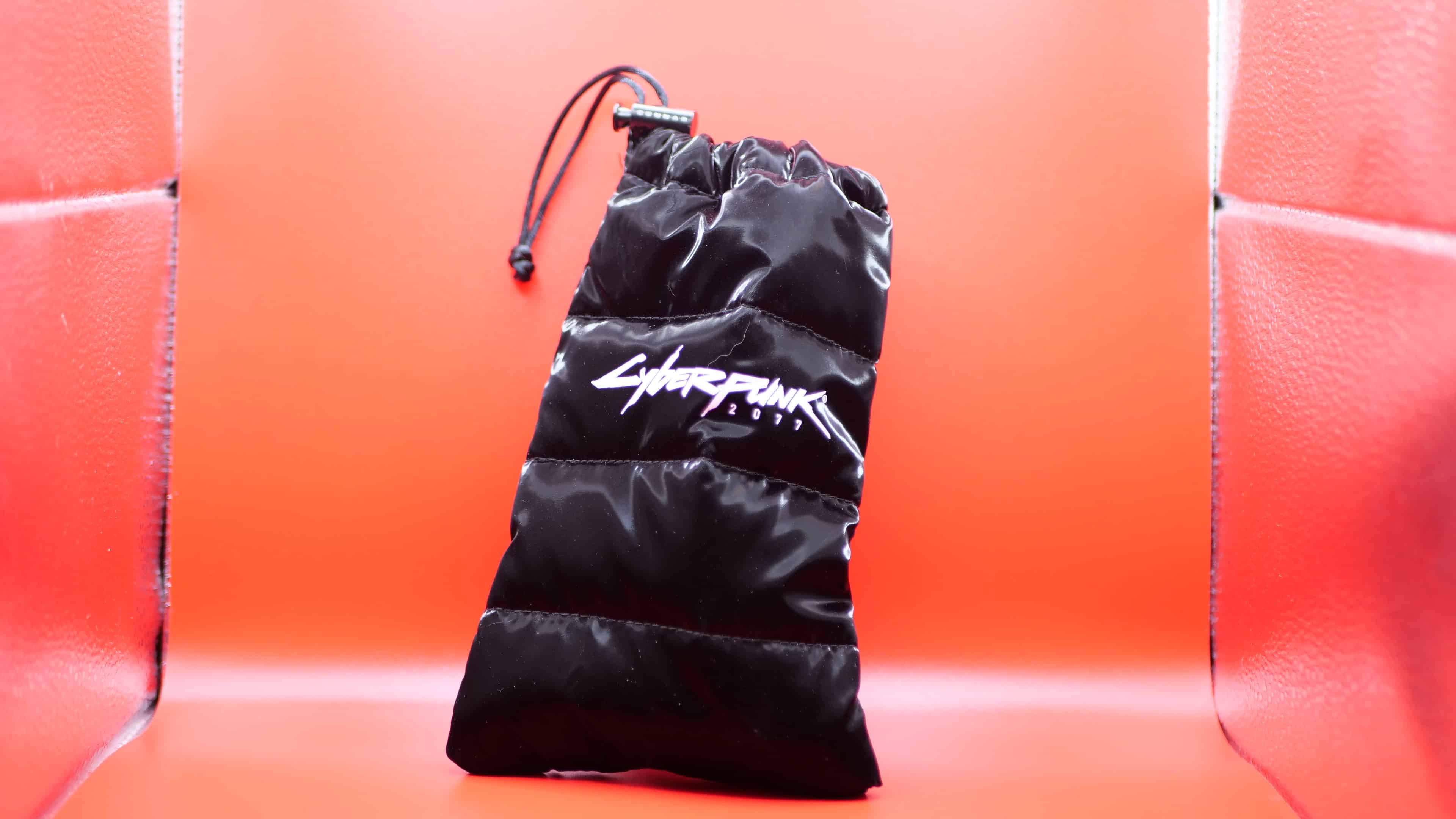 Unfortunately, this doesn’t come with a hard case like The Witcher glasses did. Considering how premium these actually look and feel, I’m surprised they didn’t opt for a hard case to keep them safe. Instead, you get a padded puffy sleeve, which on its own does look great. Pictures don’t do it justice; all it looks like is a black sleeve with the Cyberpunk 2077 logo on it, but it has a reflective sheen.