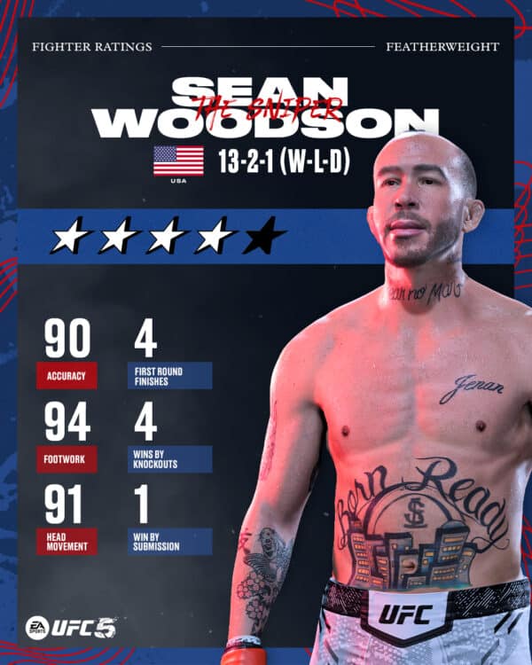 Electronic Arts have released the latest free fighter for UFC 5 as part of a free update on all platforms. Players will see this as EA UFC 5 update 1.023 (ver. 1.2), which adds Sean Woodson to the roster for free.