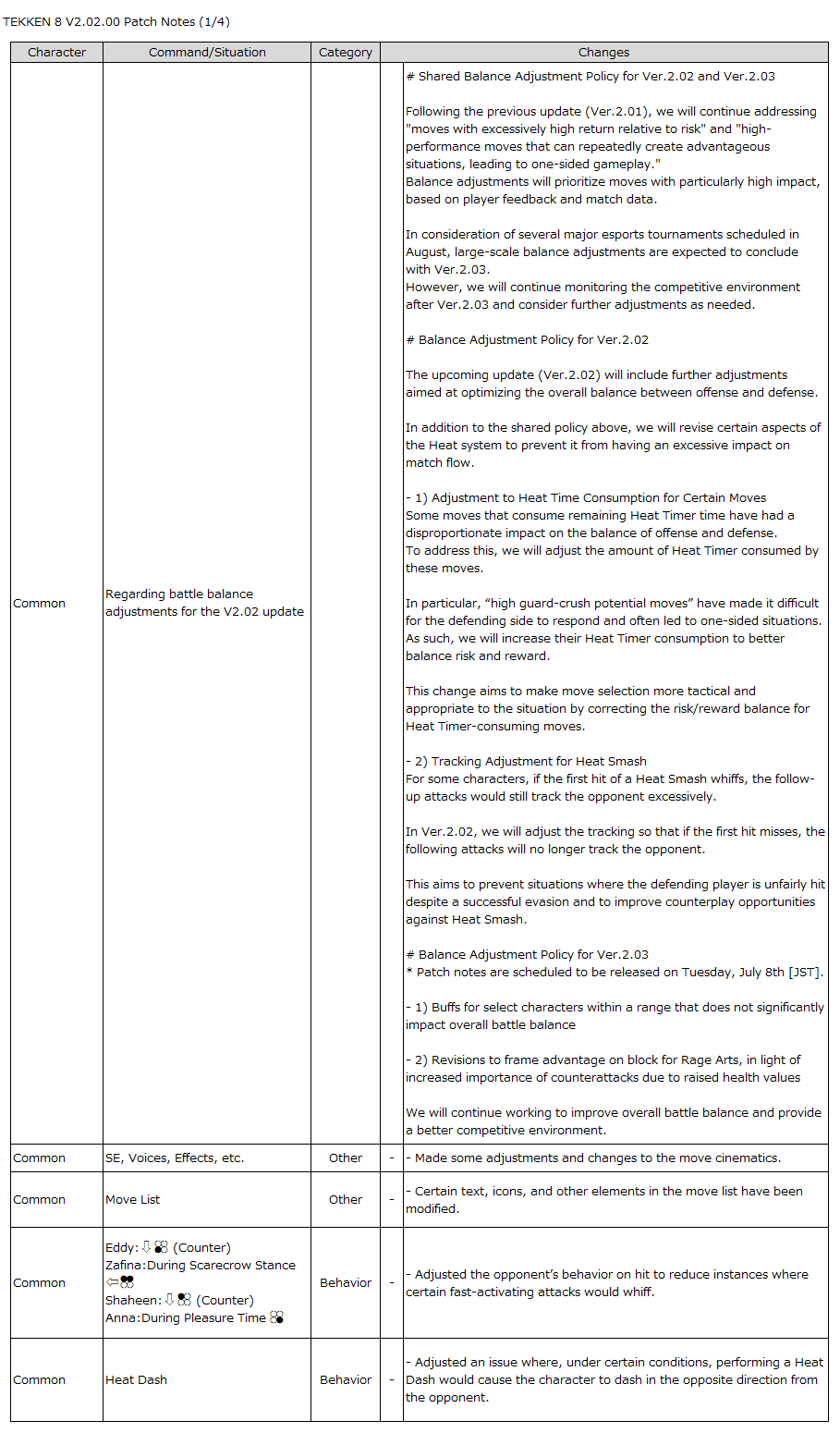 Following the previous update (Ver.2.01), we will continue addressing “moves with excessively high return relative to risk” and “high-performance moves that can repeatedly create advantageous situations, leading to one-sided gameplay.”