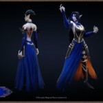 In the style of Shanoa, the powerful warrior from Castlevania: Order of Ecclesia. A blue and black gothic dress with dark flowing fabrics, dark metallic accents, and mysterious markings.